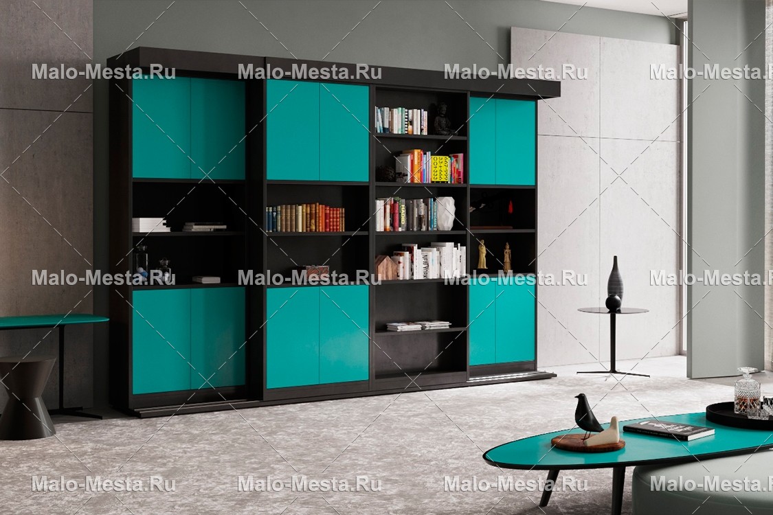 Этой моделью открывается линейка Evolution, общая конструкторская особенность которой — раздвижение половинок шкафа в стороны. Кровать извлекается из освобожденного пространства посередине.
