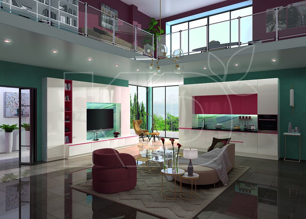 Многоступенчатая технология покрытия StrongCoat делает материал устойчивым к механическим воздействиям, перепадам температур и влажности, значительно продлевая срок эксплуатации гарнитура. Также, благодаря этой технологии, фасады приобретают идеально гладкое глянцевое покрытие. Светодиодная подсветка по цокольной части кухни, играя на глянцевых фасадах гарнитура, демонстрирует всю красоту гладких поверхностей. Цветовая гамма кухни представлена в сочетании оттенков фуксии и насыщенного черного. Благородство этого дуэта блестяще отражает глянцевое покрытие.
