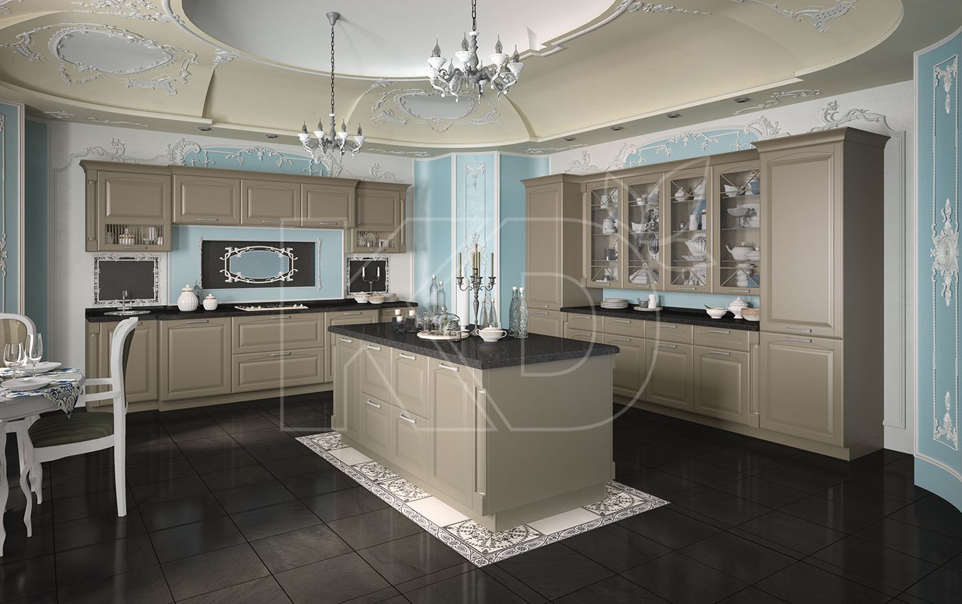 Фасады «Изабель» создаются из массива бука со вставками из МДФ и заключаются в объятья изящных пилястр. Верхний ярус с импостами и балюстрадами в крайних фасадах выглядит не менее элегантно. Им вторит буфет, чьи матовые, словно залитые дождём витражи, подчёркивает тонкая деревянная раскладка. Всё это великолепие предстает в нежных перламутровых цветах, идеальных для общей эстетики модели. И финальный штрих – ручки фасадов, изящные, словно ленты на платье венецианской кокетки.