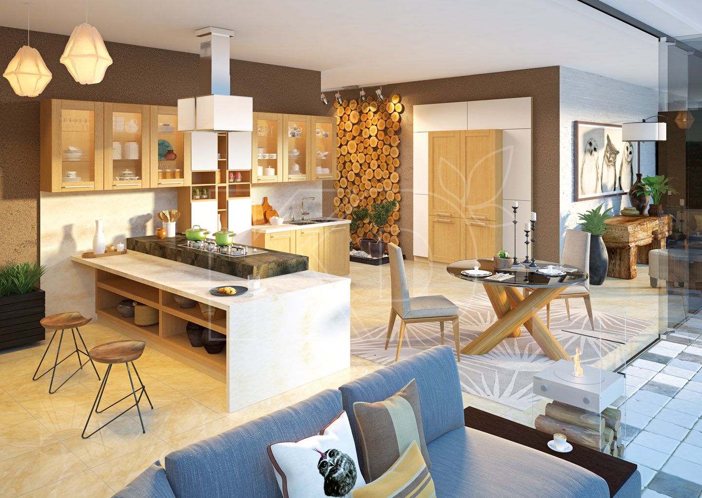Во всем интерьере кухни прослеживается тема обращения к натуральным природным материалам, стилизованным под необработанные, будто только что принесенные из леса. Такая атмосфера помогает создать концепцию дома, в котором все подчиняется простым законам экологичности.