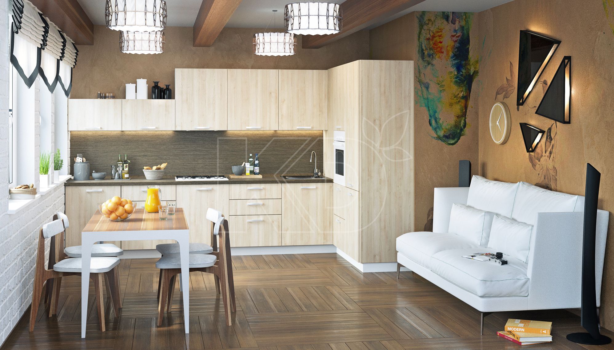 Внешняя эстетика, эргономичность, «маленькая цена» – отличительные особенности этой угловой кухни. Фасады модели выполнены из экоплиты Egger с текстурой под дерево. Цвет и фактура выбранных материалов создают уют и комфорт в любом интерьере, однако дизайнеры предусмотрели для данной модели не одно, а 5 цветовых решений текстур.