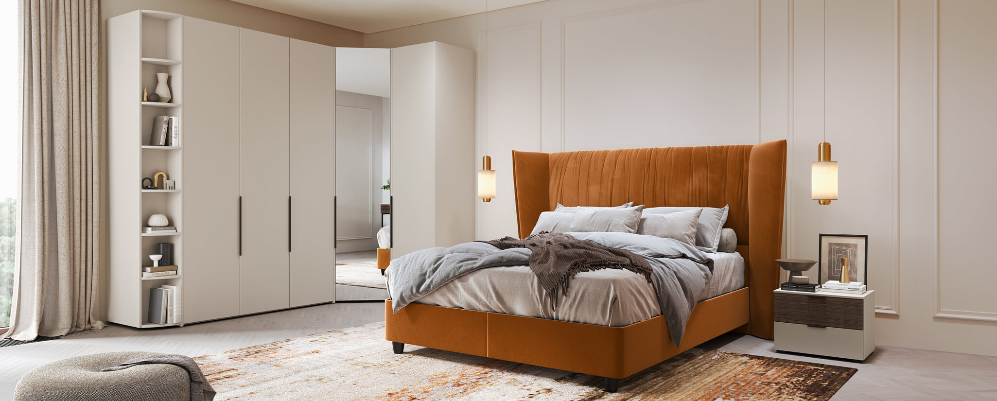 Обаяние спальни MONAKO кроется в сочетании лаконичной формы, теплой палитры и приятной тактильности. Фасады коллекции в премиальной шелковой эмали Cashmere дополняются вставками с натуральным шпоном, в том числе, декорированным эксклюзивным тиснением.