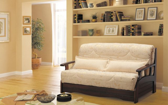 Раскладной диван «Огниво» был разработан дизайнерами специально для гостиной городской квартиры и загородных домов. Чехол дивана украшает элегантный узор простежки, а подлокотники, задняя спинка и царга выполнены из натурального дерева. Цвет деревянного декора подбирается к цвету ткани обивки.